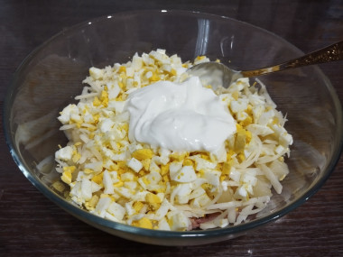 Сваренные и остывшие яйца также порезала кубиками. Добавила майонез и перемешала.