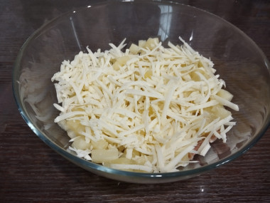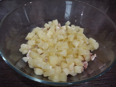 Пока отваривались яйца, порезала кусочки курочки мелкими кубиками,выложила в салатник. Добавила порезанные кубиками ананас и сыр,натертый на крупной тёрке.