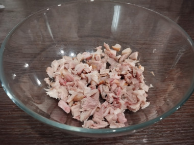 Копченую курицу очистите от кожи и нарежьте небольшими кубиками.