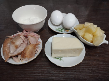 В салатнике соедините нарезанные копченое мясо, ананасы, сыр и яйца.