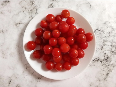 Помидоры переберите, удалите плодоножки. Хорошо вымойте черри. По необходимости сделайте проколы в местах крепления плодоножки при помощи зубочистки. Это поможет помидорам остаться целыми и не потрескаться.