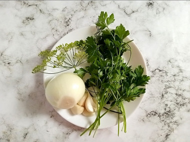 Из зелени взяла петрушку и зонтики укропа. Луковицу нарезала кольцами, а чеснок оставила зубчиками.