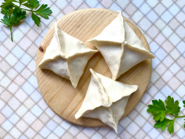 Теперь сформируйте конвертики. Поднимите края теста к центру и хорошенько защипните. Из одной пластины я сделала 9 маленьких конвертиков. А из второй пластины решила сделать конвертики покрупнее и начинки побольше, поэтому и получилось всего 4 штуки. Крупные конвертики из более толстого слоя теста формировать удобнее и они не так сильно деформируются при выпекании.
