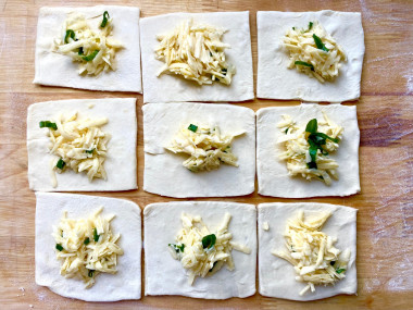 В центр каждого квадратика выложите по неполной столовой ложке начинки. Начинки не должно быть слишком много, иначе она разорвет швы конвертиков и вытечет во время выпекания.