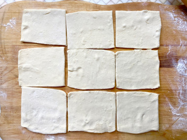 Затем тонко раскатайте на присыпанном мукой столе в ровный квадрат.Ножом для пиццы или обычным ножом нарежьте тесто на небольшие квадраты.