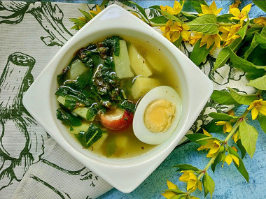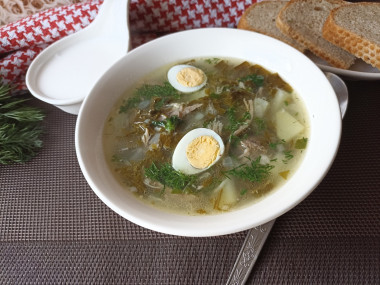Зеленые щи разлейте по тарелкам, добавив в каждую половинку вареного яйца. По желанию подавайте со сметаной. Приятного аппетита!