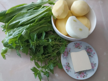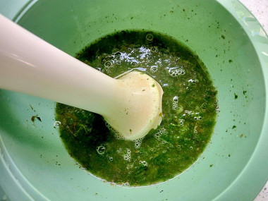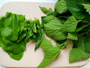 Зелень тщательно промойте под проточной водой. У крапивы удалите толстые стебельки, используйте молодые, нежные листочки. Если крапива слишком жгучая, наденьте перчатки. Крапиву мелко нарежьте.