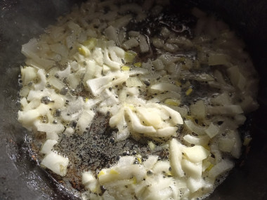 В кастрюле растопите сливочное (или топленое) масло. Выложите репчатый лук. Обжарьте лук на умеренном огне до золотистого цвета, периодически помешивая.