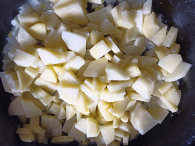 Выложите в кастрюлю к луку подготовленный картофель. Помешивая, обжарьте картофель с луком около 5 минут.