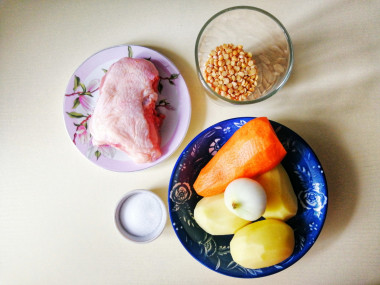 Калорийность продуктов: Свинина, Вода, Картошка, Морковь, Лук, Горох, Растительное масло, Соль