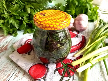 Банки и крышки хорошо вымойте с содой и простерилизуйте. Выбрать способ стерилизации вы можете прочитав статью на эту тему в конце рецепта. Плотно уложите зелень в баночки до самого верха, постоянно прижимая ложкой.