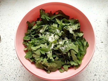 Крапиву нарежьте вместе с веточками на некрупные фрагменты. Маленькие листочки оставьте целыми. Сложите всё в глубокую чашку или миску и посыпьте солью.