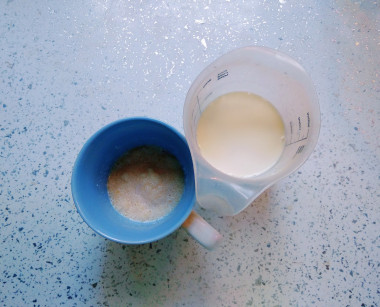 Желатин залейте 50 мл холодного молока и оставьте набухать в течение 7-15 минут в зависимости от размера кристалликов. Желатин можете использовать быстрорастворимый или обычный пищевой для десертов.