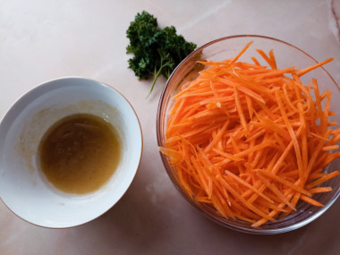 Натертую морковь переложите в подходящую емкость, добавьте измельченную петрушку. Сверху полейте приготовленной заправкой и хорошо перемешайте салат вилкой или просто руками.