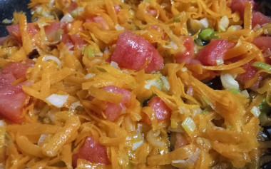 Помидоры заливаем кипятком на пару минут, снимаем кожицу, нарезаем ломтиками. Кладем в сковороду. Готовим все вместе на небольшом огне десять минут.
