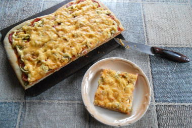 Тесто дрожжевое замесила быстро и подошло оно хорошо, я его оставляла на час в разогретой до 50 градусов духовке. Решила готовить одну большую пиццу на весь противень, он у меня размером 34 на 38 см, вместо двух небольших.