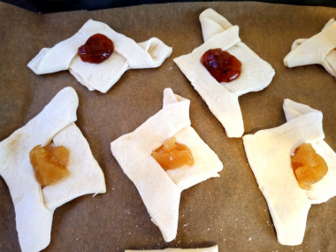 Выложите противень бумагой для выпечки. Уложите на нее заготовки. В центр каждой положите по чайной ложке варенья. Пусть вас не пугает, что варенья много — тесто при выпечке хорошо поднимется и варенье окажется в углублении.