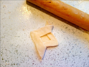 Разогните угол обратно и загните таким же образом противоположный, уже прорезанный угол. При этом у вас загнется только получившаяся полоска. По аналогии прорежьте тесто с этой стороны.
