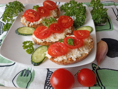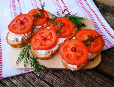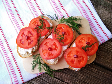 Бутерброды сделала для сына и его друзей. Ребята неожиданно пришли в гости и надо было чем-то накормить) Бутерброды любят все, а в кулинарной книге был сохраненный рецептик) У меня был обычный свежий молочный батон. Поджаривать его не стала, хлеб был очень вкусный сам по себе. А вот вместо майонеза взяла творожный сливочный сыр и для более жидкой консистенции разбавила сметаной. Получилась очень вкусная густая масса. Сыр был Моцарелла и кусочек Голландского. Чеснока взяла один зубок, чтобы ребятам не сильно остро было. Еще добавила веточку нарезанного укропа. Бутерброды готовятся быстро, это несомненный плюс! Украсила помидорки зернами граната и укропом. Дети смели все сразу и были явно довольны) Я тоже попробовала, очень вкусно, пикантно, намазка нежная, помидоры сочные. Все вместе просто супер. Надо себе тоже на завтрак приготовить)