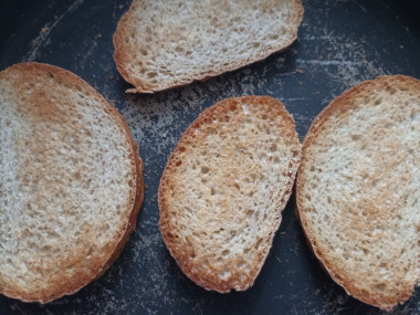 Багет нарежьте на кусочки. Бутерброды можно сделать на скорую руку сразу нанося намазку на батон. Но можно ломтики немного подсушить в духовке минут 7-10 при 180 градусах, можно подсушить на сухой сковороде или обжарить с добавлением небольшого количества растительного масла, сделав гренки.