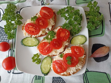 На каждый бутерброд выложите 1-2 кружочка помидор. Бутерброды готовы! Можно сразу подавать к столу, украсив веточкой зелени. Приятного аппетита!