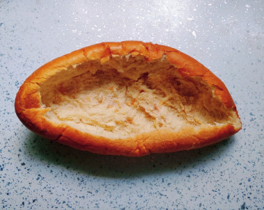 Теперь займитесь основой для пиццы. Возьмите хлеб и отрежьте у него основание. Толщину основания выбирайте по вкусу — я сделала ее потолще, так как хлеб был очень мягким и сильно сминался. Данное в рецепте количество продуктов рассчитано на две средние пиццы. Вторую пиццу можете сделать из верхушки хлеба, срежьте только у нее круглую часть, чтобы пицца была устойчивой.