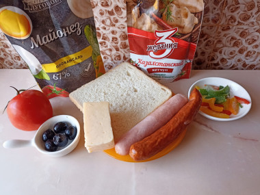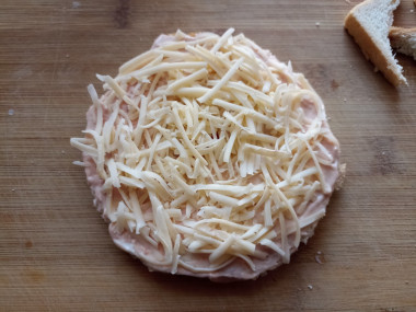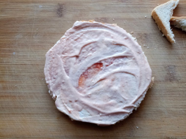 Смешайте кетчуп с майонезом и смажьте этой смесью хлеб. Сверху посыпьте основу тертым сыром.
