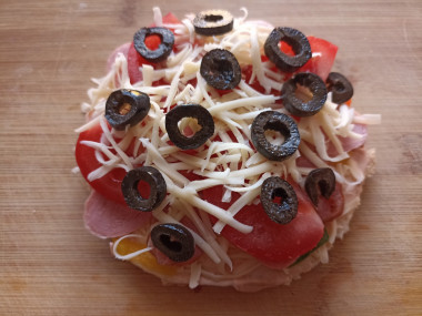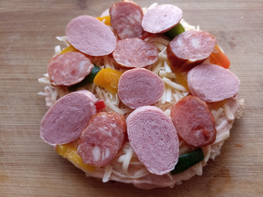 Выложите сверху кусочки колбасы и помидоров. Я уложила внахлест.