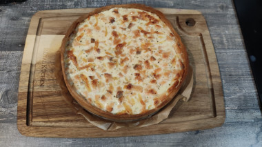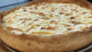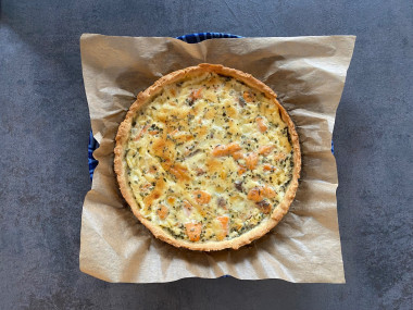 Выпекайте пирог в заранее разогретой до 180С духовке около 30 минут. Если краешки пирога зарумянились и консистенция заливки стала плотной, значит, пирог готов. Время и режим выпечки могут отличаться. Ориентируйтесь на работу своей духовки.