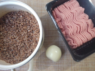 Для приготовления берите удобную просторную чашу и соедините в ней гречку и мясной фарш.