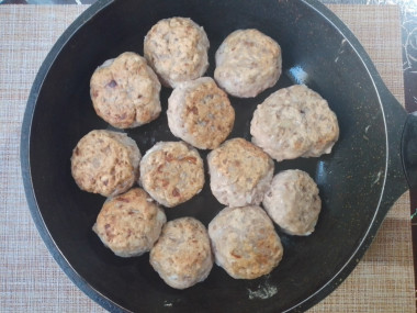 На горячую сковороду налейте немного растительного масла. Из мясной массы слепите небольшие тефтели и выложите их на сковороду.