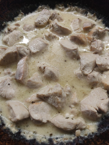Переверните кусочки филе на другую сторону и подрумяньте до золотистого цвета, не забывая помешивать. Благодаря румяной корочке, образовавшейся на поверхности кусочков, мясной сок останется запечатанным внутри, и грудка получится сочной и мягкой.