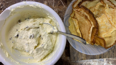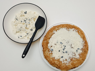Далее добавила уже сухой изюм в творожную массу, перемешала и намазав на блины, свернула в трубочки.