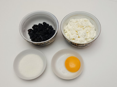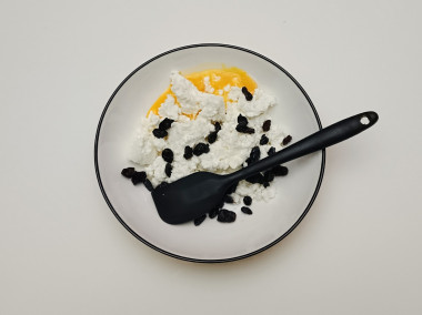 Смешала в миске вкусный, жирный творог с желтком. Добавляю к нему сахар, изюм и щепотку соли.