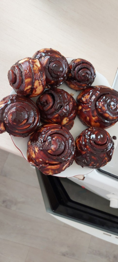 Когда сливочный крем впитается в булочки, а шоколадная глазурь уже будет готова, поливаем ею Синабоны. Вот и всё! Ароматное лакомство готово. Приятного аппетита!