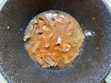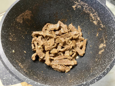 Когда мясо покроется аппетитной румяной корочкой, посыпьте его специями, перемешайте и жарьте еще 1 минуту.