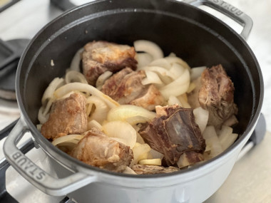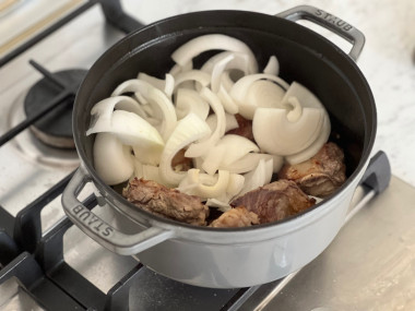На топлёное масле и на высоком огне сначала обжарила куски мяса до корочки с одной стороны. Затем эти кусочки перевернула и продолжила обжаривать с другой стороны до легкой золотистой корочки. Лук нарезаю купно и много. Люблю когда мясо тушится в собственном соку. Воды практически не добавляю.