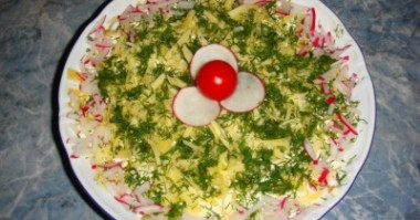 Оригинальный вкусный салат с копченой грудкой и свежим огурцом. Сейчас как раз пошла молодая редиска и я взяла её для украшения. Спасибо за вкусный рецепт!