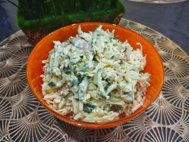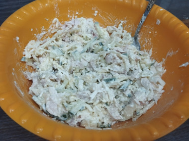 Нужно было быстро приготовить какой-нибудь салатик к приходу гостей и нашла рецепт: салат с копчёной грудкой и свежим огурцом. Все ингредиенты имелись в наличии,кроме пекинской капусты. Я заменила её на белокочанную,которую мелко нашинковала и помяла руками,чтобы мягче стала. Грудку и огурец порезала соломкой, яйца отварила и натерла на мелкой тёрке. Сыр натерла на крупной тёрке. Времени собирать салат слоями не было,поэтому я просто соединила все ингредиенты,добавила немного зелени укропа, майонез и перемешала. Быстро,просто,сочно и очень вкусно! Всем понравился салат,спрашивали рецепт. Спасибо большое Марии за чудесный рецепт!
