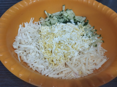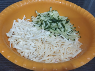 Далее, промазывая каждый слой майонезом, выложите свежий огурец, тертый сыр, измельченные белки. По желанию можете посыпать слои солью и перцем. Но я обычно не добавляю специи в салаты с майонезом.