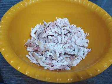 Копченую грудку очистите от кожи и костей и нарежьте небольшими кусочками. Можете просто разобрать мясо на волокна. Копченую курицу можете заменить на обычное отварное или обжаренное филе.