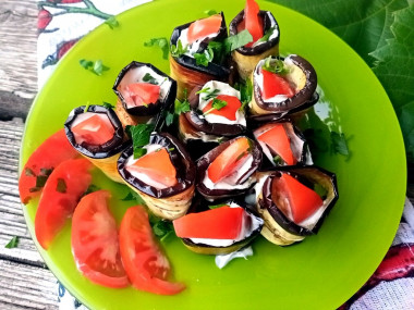 Сегодня на ужин приготовила баклажаны по рецепту "Язычки из баклажанов с чесноком и помидорами закуска". Подобные рулетики делаю каждый год в сезон свежих овощей с разными начинками. Этот рецепт приглянулся своей простотой и быстротой приготовления. Для начала пластинки баклажанов посыпала солью, чтобы вышла горечь, если она есть. Потом промокнула бумажным полотенцем и обжарила на обычной сковороде. Для начинки заменила майонез на сметану. Чеснок добавила в сметану, а не в зелень. Мне кажется, так чеснок лучше распределится) Кинзу заменила не менее ароматной петрушкой. Язычки сворачивались в рулетики очень легко. Сразу же подала их на стол со свежим овощным салатом. Жареные баклажаны прекрасно сочетаются с острой начинкой и свежим, сочным помидором. Это очень вкусно!