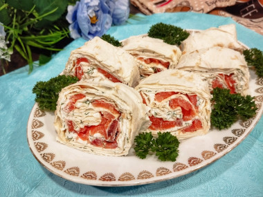 В творожный сыр я добавила измельченную зелень укропа, немного сока лимона,перемешала и смазала лист лаваша. Выложила кусочки форели слабосолёной и свернула лаваш рулетом.