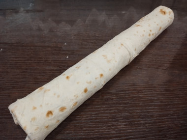 Скрутите лаваш рулетом, а затем заверните его в пищевую пленку. Я разрезала рулет на две части, так как он получился слишком длинным. Уберите рулет минимум на 30 минут в холодильник, чтобы лаваш как следует пропитался и стал мягким.