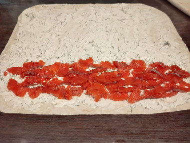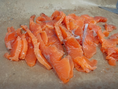 Разложите кусочки рыбы с одного длинного края примерно до середины. Если у вас цельный кусок рыбы, то предварительно тонко нарежьте его острым ножом.