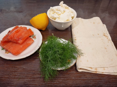 Как сделать рулетики из лаваша с красной рыбой и сыром? Подготовьте продукты. Лаваш выбирайте самый свежий и вкусный. Рыбу можете взять как покупную, так и засоленную самостоятельно. Очень удобно пользоваться готовой нарезкой, как у меня. Рыба подойдет любая красная — семга, кета, форель, горбуша. Сыр возьмите натуральный, без заменителей молочного жира. У меня сыр уже с добавлением зелени.