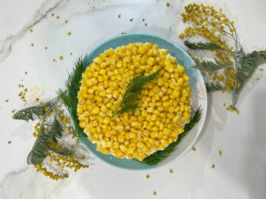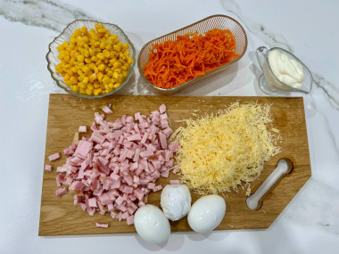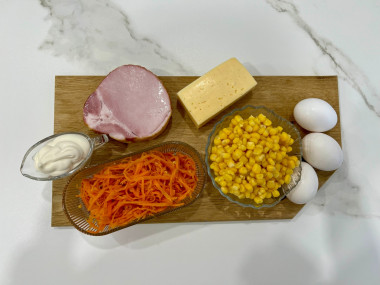 Вместо копчёной грудки я использовала корейку, которая также прекрасно гармонирует с нежной сладостью кукурузы. Корейская морковь придаёт салату пикантность и лёгкую остроту, а все ингредиенты идеально дополняют друг друга, создавая гармоничное сочетание.