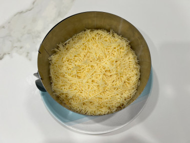 Третьим слоем выложите сыр, натертый на средней или мелкой терке. Его так же промажьте майонезом.
