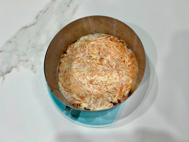 Нарезанную морковь выложите следующим слоем салата и смажьте майонезом.