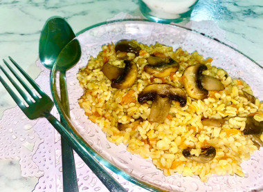 Захотелось приготовить что-нибудь легкое. Попался рецепт булгур с грибами и луком. Готовила впервые, поэтому старалась соблюдать все этапы приготовления. Из специй использовала черный молотый перец и сушеный базилик. Булгур по этому рецепту рассыпчатый в сочетании с сочными и ароматными шампиньонами получилось очень вкусно. Большое спасибо за такой простой и вкусный рецепт.